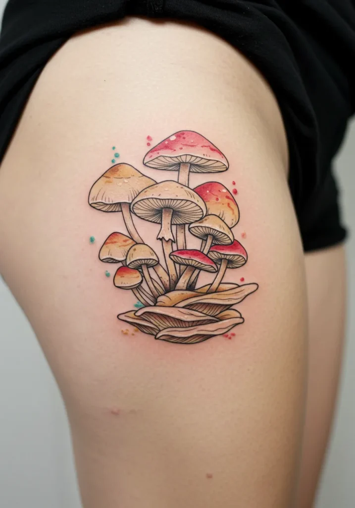 This adorable tattoo features a whimsical cluster of mushrooms drawn with ultra-fine lines and dreamy watercolor shading. The mushrooms vary in size and shape, giving it a natural, foraged look, with warm tones of earthy beige, peach, and crimson. The subtle teal and red dots sprinkled around the mushrooms add a magical, almost fairy-tale vibe. It s placed beautifully on the thigh, giving it enough room to shine without overpowering the space.
