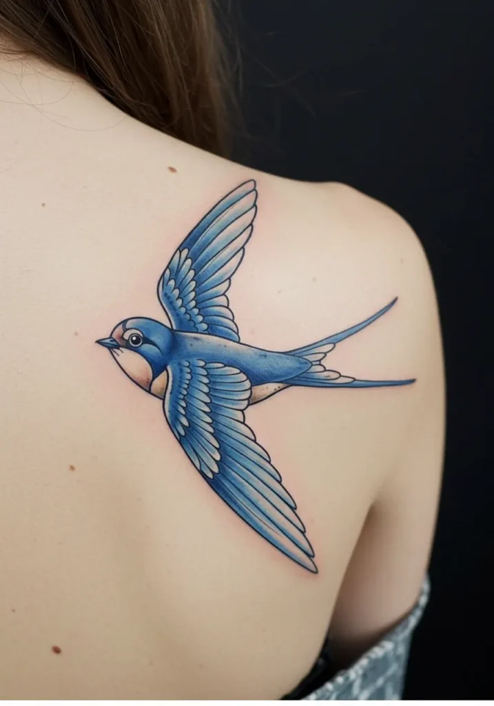 This vibrant swallow tattoo takes flight across the shoulder blade in a wave of soft blues and delicate linework. The wings are outstretched with elegant precision, feathered in varying shades of sky and cobalt. The soft cream accents on the chest and face give it warmth and personality, while the clean outline keeps it crisp and light. The whole design feels like it s mid-motion, soaring with freedom and grace.