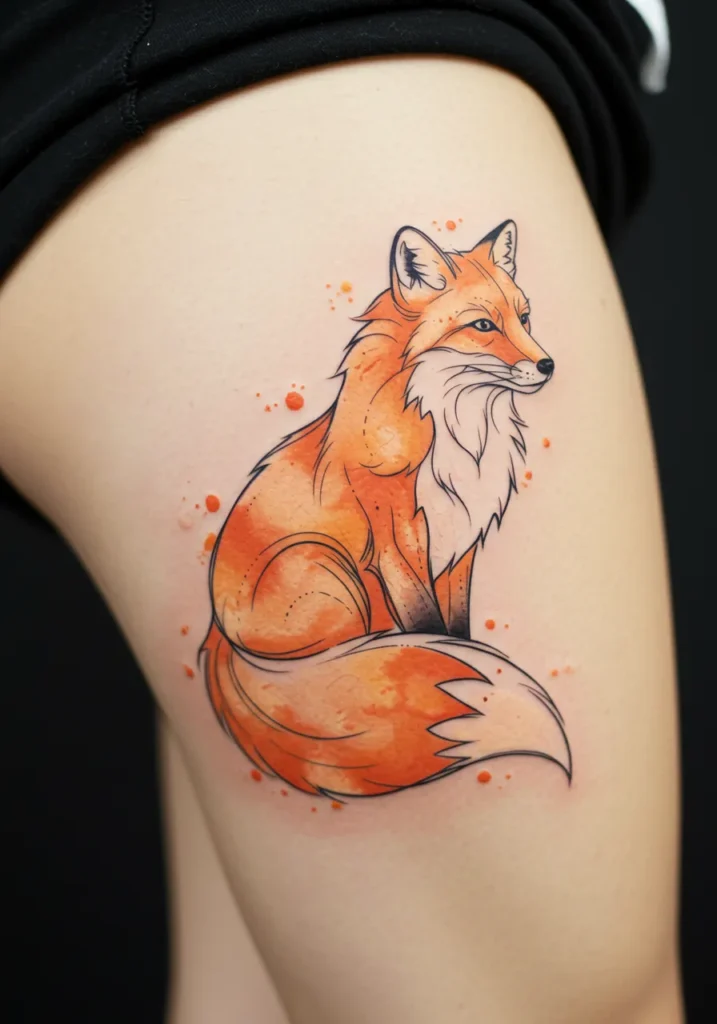 This fine line fox tattoo brings all the woodland charm straight to the thigh. The fox sits curled in a cozy pose, with bright orange watercolor shading that adds warmth and personality. Soft, delicate outlines shape its fur, ears, and tail without feeling heavy. The splashy background dots in burnt orange give it an extra artsy vibe while keeping the whole design playful and clean.