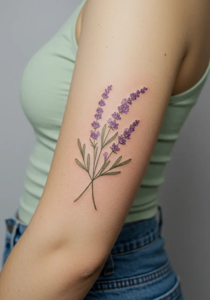This lovely tattoo features a delicate pair of lavender sprigs drawn in the softest fine lines. Each tiny bloom is detailed in calming shades of violet and lilac, while the long, narrow leaves balance the design in soft sage green. The layout follows the curve of the upper arm beautifully, giving it a natural, graceful flow without feeling overly structured. It s dainty, botanical, and oh-so-fresh.