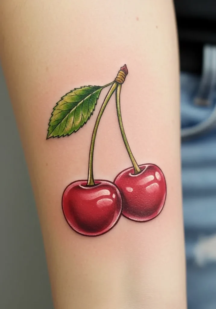 I just love how fun and fresh this tattoo feels. It s cute without being overly cutesy, and the shine on the cherries adds that little touch of gloss that makes them look good enough to eat. Honestly, it gives me retro fruit-punch energy in the best possible way. It s the kind of piece that makes you smile every time you catch a glimpse of it.