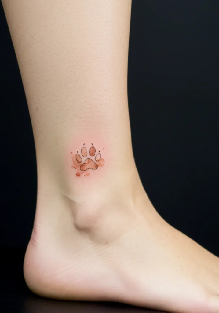 This tiny paw print tattoo is placed sweetly above the ankle, blending delicate fine lines with soft watercolor-style shading. The little paw pads are filled with warm reddish-orange tones, and subtle ink splashes give it a playful, almost muddy feel like a memory frozen in motion. It s minimal, clean, and oh-so-cute without being too obvious.