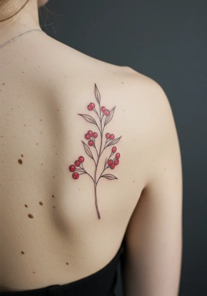 This dainty tattoo features a slender berry branch stretched along the shoulder blade, brought to life with crisp fine lines and rich pops of red. Each little berry has a subtle glisten, giving it a juicy, almost dewy look, while the leaves are outlined in a soft botanical style that feels clean and natural. The placement is perfectly balanced with the shape of the shoulder, making the whole thing look effortless and organic.