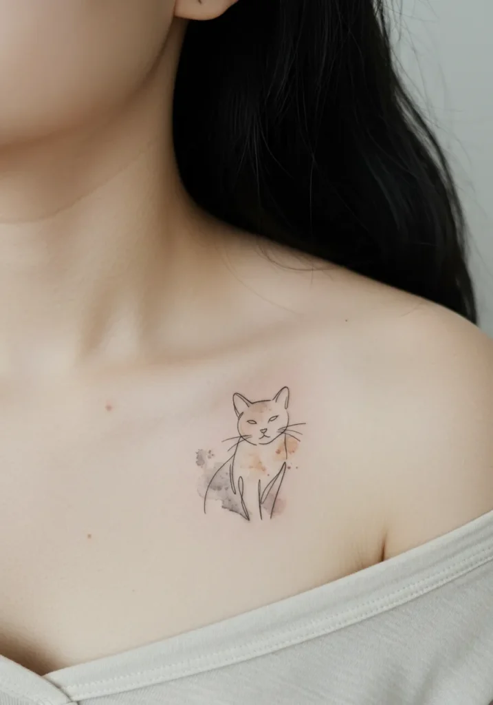 This tattoo captures a cool and composed cat using just the subtlest fine lines. Its minimal outline feels effortless, almost like a single confident brushstroke. A soft wash of muted watercolor shades warm beige, soft gray, and a kiss of brown gives the piece a dreamy touch without overpowering the simplicity. The placement on the collarbone adds to the soft and elegant vibe, like a whispered nod to feline grace.