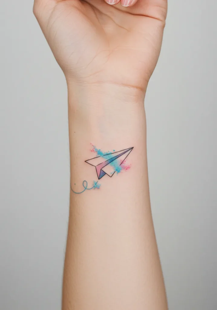 This playful little tattoo features a crisp fine line paper airplane in flight, trailing a swirl of soft pastel magic behind it. The design floats on the inner wrist, surrounded by dreamy splashes of pink and blue watercolor that feel like a burst of imagination. The paper plane itself is shaded with subtle tones, giving it just enough depth while keeping that classic hand-folded charm. It s tiny, clean, and full of movement.