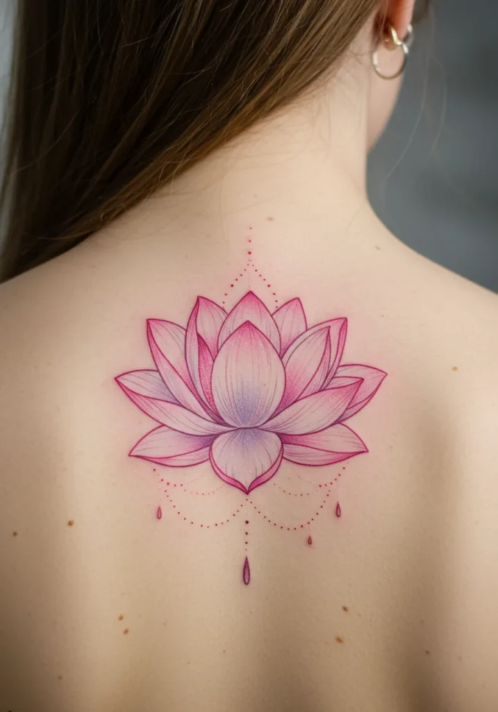 This stunning lotus tattoo blooms beautifully across the upper back, radiating with soft pink and purple tones. Each petal is outlined with precise fine lines and shaded in a gradient that feels light and ethereal. Dotwork elements float above and below the flower, adding a sense of movement and elegance without stealing the spotlight. The entire piece feels symmetrical and grounded while still being airy and feminine.