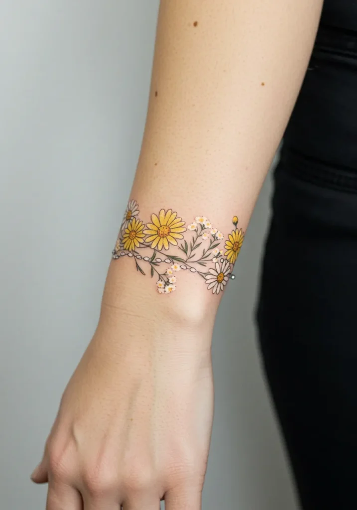 This whimsical floral bracelet tattoo wraps delicately around the wrist like a blooming garden you can wear. The fine line stems twist and weave to form a seamless circle, with bright yellow daisies and tiny white blossoms scattered throughout. The design is soft and feminine, using gentle curves and just the right amount of color to create a wearable piece of nature. It s dainty without disappearing and detailed without feeling overdone.