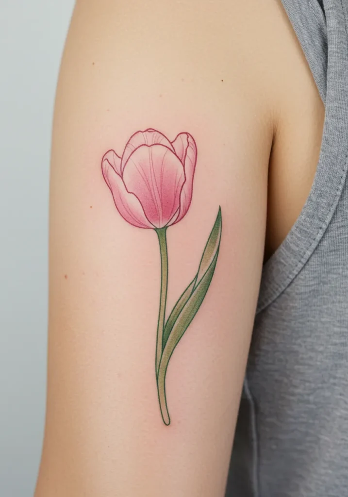 This beautiful fine line tattoo features a single pink tulip blooming on the upper arm. The petals are softly shaded in rose tones with delicate linework that adds depth without being heavy. The green stem and leaves are slender and elegant, giving the entire design a fresh and botanical feel. Everything about it feels clean, simple, and super feminine.