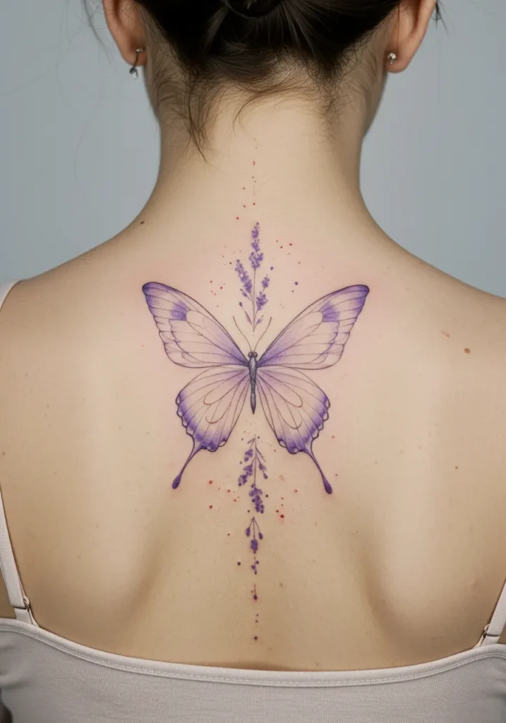 This stunning fine line tattoo features a delicate butterfly sitting at the top of the spine, surrounded by soft purple hues and subtle lavender flower accents that cascade down the back. The butterfly s wings are finely detailed with soft shading and crisp lines, while the gentle gradient of purple creates a dreamy, ethereal effect. The tattoo is complemented with little dots and splashes of color, adding a dynamic, almost watercolor feel that flows beautifully along the spine.
