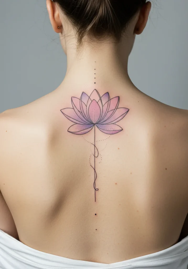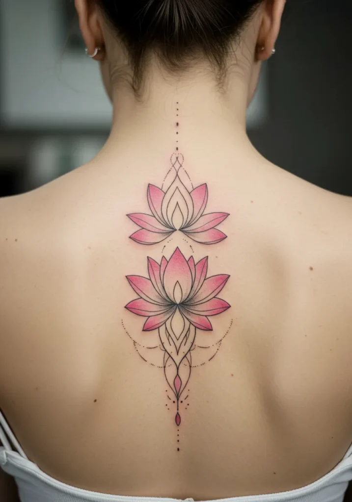 This breathtaking fine line tattoo features two beautifully detailed lotus flowers perfectly aligned along the spine. The flowers are drawn in soft pinks with delicate shading that adds depth and dimension, while the black fine lines around the petals create a striking contrast. Between the flowers are geometric shapes and dotwork, giving the design a symmetrical and balanced feel. The combination of soft gradients and sharp lines makes this tattoo feel both ethereal and grounded, flowing gracefully down the spine.