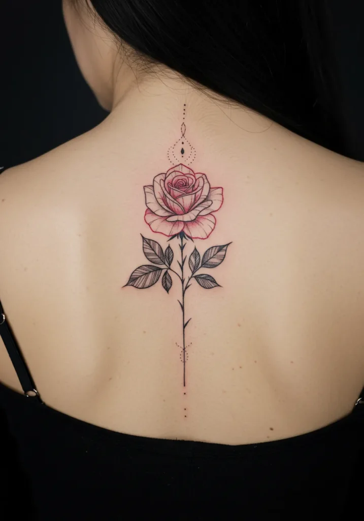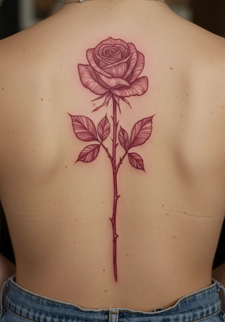 This stunning fine line tattoo features a delicate rose, perfectly centered along the spine, with intricate detailing on both the flower and its stem. The soft, rich shading on the rose petals creates a sense of depth, while the sharp, fine lines of the stem and leaves add a touch of elegance. The tattoo s use of burgundy and deep red tones makes it feel both romantic and bold, creating a strong contrast against the skin while maintaining a soft and feminine aesthetic.