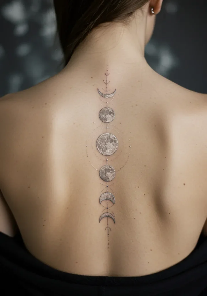 Moon Phases Fine Line Spine Tattoo