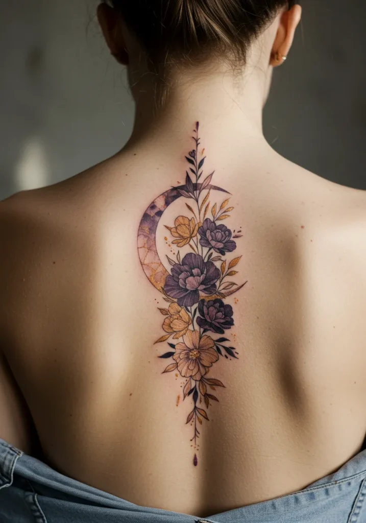 I adore how this tattoo blends celestial elements with nature in such a harmonious way. The crescent moon, typically a symbol of change and growth, pairs beautifully with the delicate flowers, which represent beauty and femininity. The soft yet bold colors make it feel both earthy and ethereal, and I can t help but love how the flow of the design mirrors the natural curve of the spine. It s a striking piece that feels both elegant and deeply symbolic. Perfect for anyone who wants a tattoo that s as meaningful as it is beautiful!