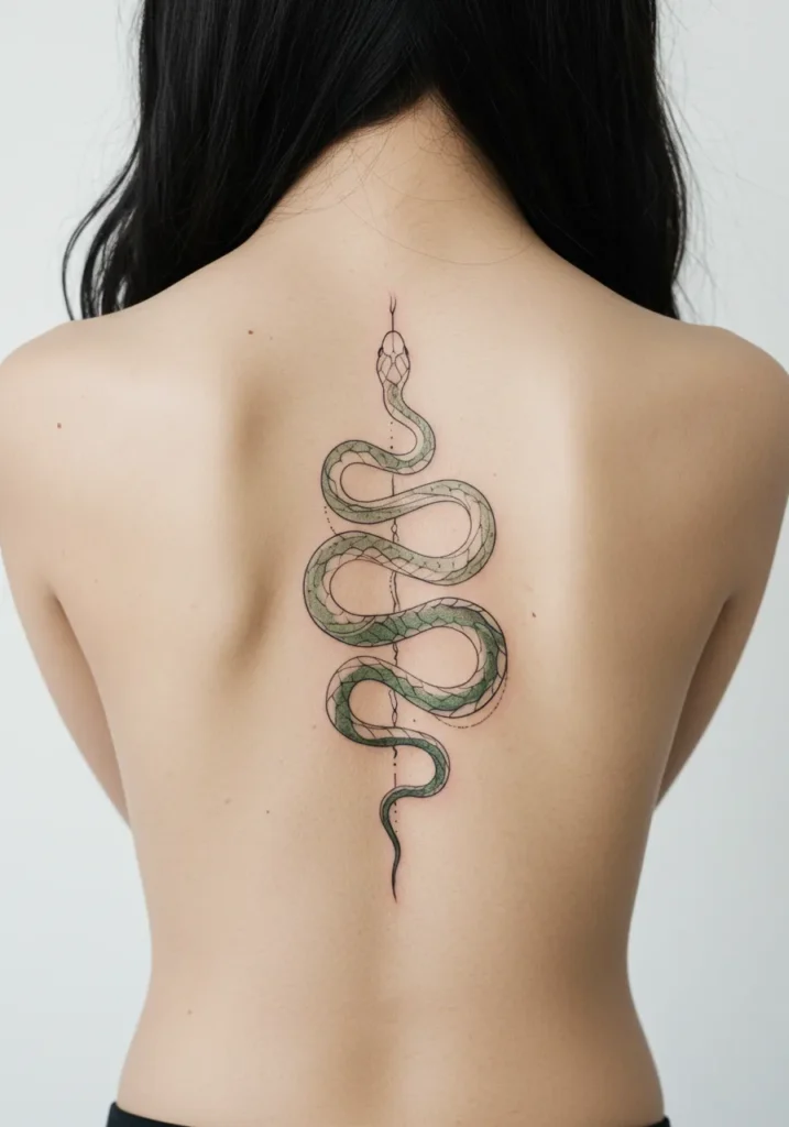 This fine line spine tattoo features a beautifully detailed snake, winding its way down the spine in a sleek, smooth motion. The snake s body is intricately designed with fine lines, showcasing subtle shades of green that blend delicately with the black outlines. The snake s head rests at the top, with sharp, defined features and a slight curve that gives the tattoo a natural flow. The geometric dotwork accents around the snake add to the overall elegance, creating a striking yet minimalist design.
