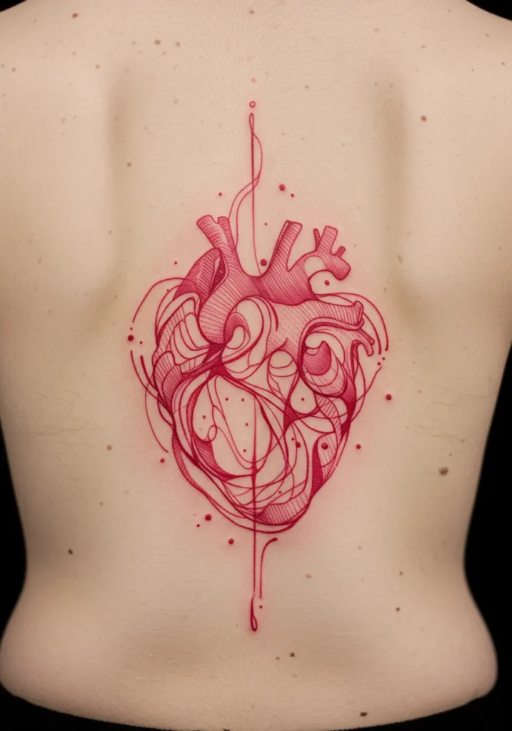 This bold fine line tattoo features a beautifully intricate heart design that runs down the spine, combining sharp lines with delicate dotwork accents. The heart is rendered in stunning red tones, with intricate details that make it appear almost 3D. The lines flow seamlessly into the spine, creating a sense of movement and organic connection between the heart and the body. The tattoo s symmetry and use of negative space add to its elegance, giving it a modern yet timeless look.