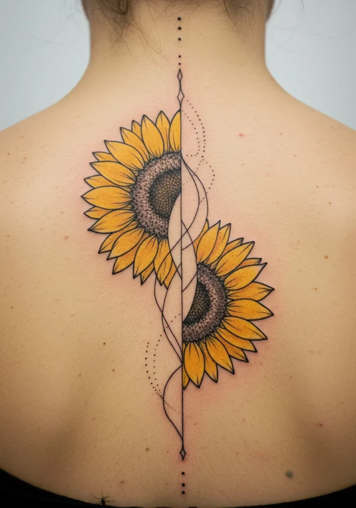 This stunning fine line tattoo features two beautifully detailed sunflowers positioned perfectly along the spine. The sunflowers vibrant yellow petals contrast beautifully with the intricate black outlines and soft shading of the flower centers. The flowers are intertwined with delicate geometric shapes and dotwork, creating a flow that follows the natural curve of the back. The design is elegant yet bold, with the clean lines of the sunflowers contrasting against the softness of the surrounding details.
