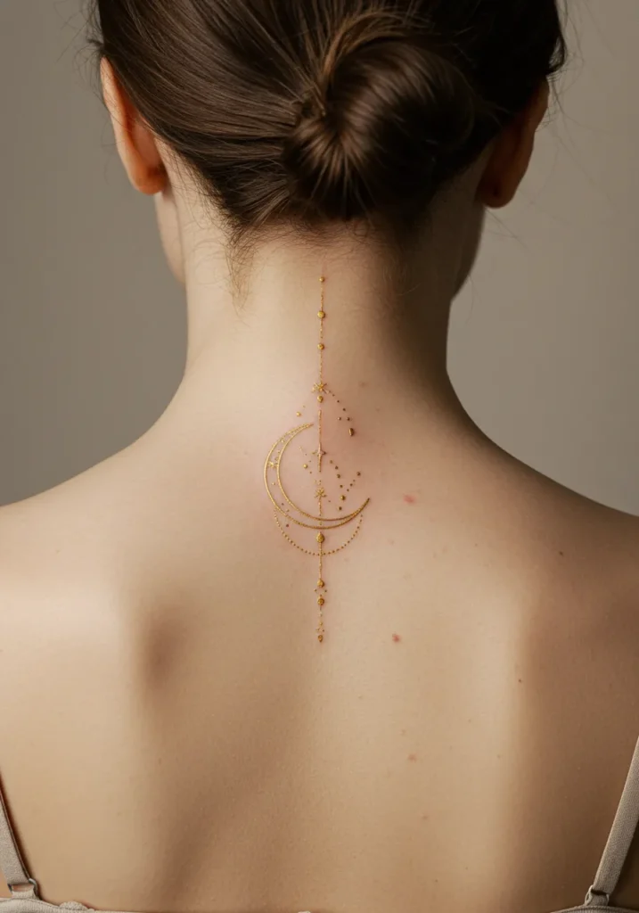 I absolutely adore how minimalistic yet captivating this tattoo is. The gold lines bring a soft, elegant glow to the tattoo, while the dotwork and small stars add a celestial, almost magical feel to the design. It s perfect for anyone who loves symbolism especially the moon, which represents change, femininity, and transformation. The fine lines give it such an airy, delicate feel, and the way it follows the spine s natural curve makes it feel like a part of the body, not just a design. It s elegant, understated, and simply stunning!