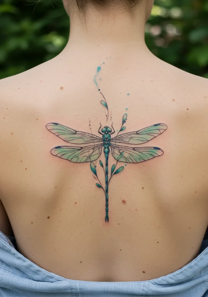 This delicate and enchanting tattoo depicts a stunning dragonfly, gracefully positioned on the spine, with its wings spread wide. The dragonfly is rendered with fine line detailing, giving it a light, airy feel, while soft shades of green and blue bring it to life. A trail of subtle, watercolor-like droplets and leaves flows downward from the body of the dragonfly, creating a mesmerizing, flowing design that stretches down the spine.