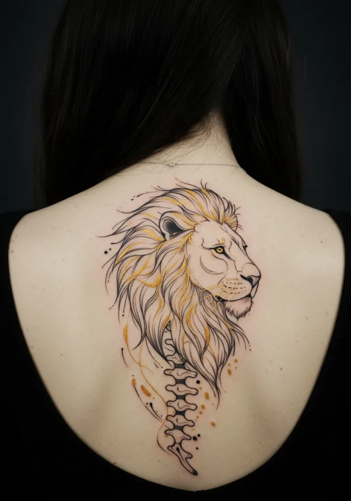 I absolutely love how this tattoo blends strength with elegance. The lion represents courage and leadership, and the fine line detailing makes it feel modern yet timeless. The golden accents in the mane give it a vibrant, almost ethereal glow, and the flow of the design along the spine makes it feel like the tattoo is a part of the wearer s body. It s the perfect mix of power and beauty ideal for anyone looking for a spine tattoo with deep meaning and striking visual appeal.