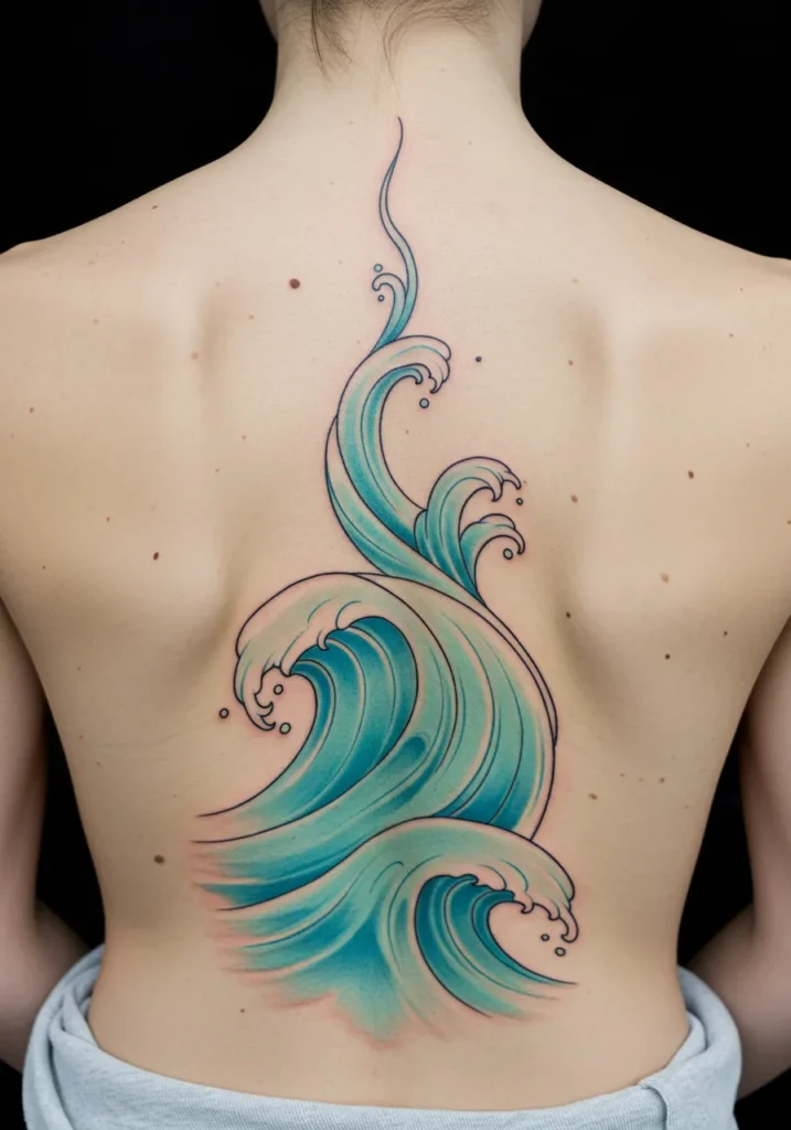 I absolutely adore how this tattoo feels both dynamic and calming at the same time. The combination of fine line detailing and the soft yet bold color palette makes the waves seem almost like they re in motion, adding a sense of freedom and fluidity to the design. It s the perfect tattoo for anyone who loves nature-inspired designs and wants something that s both eye-catching and calming. The way it flows down the spine makes it feel like an extension of the body itself. It s absolutely stunning!