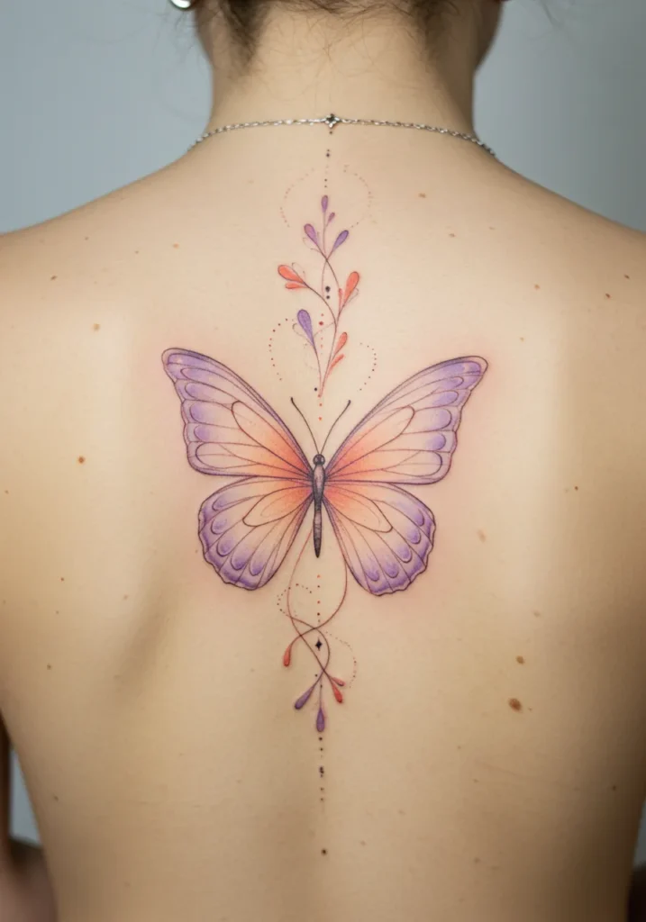 This delicate fine line tattoo features a beautifully detailed butterfly at the top of the spine, with soft gradients of purple and pink creating a gentle, almost ethereal effect on the wings. The butterfly is surrounded by intricate floral elements, with tiny bursts of color and dotted lines trailing down the spine, adding an extra layer of elegance and movement. The fine lines and soft hues make the tattoo feel both light and modern, as if it were floating just above the skin.