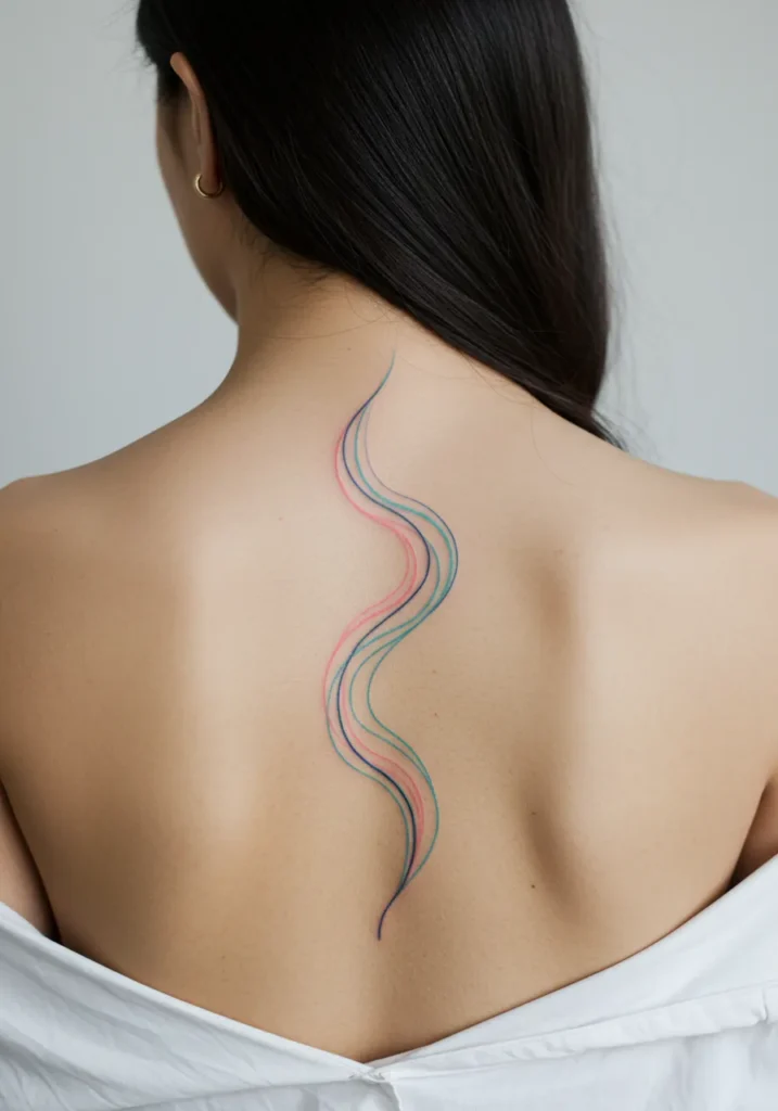 This stunning tattoo features a flowing wave-like design running down the spine, created with fine lines and soft gradients of pink, blue, and teal. The lines start with a delicate curve at the top and gradually evolve into a mesmerizing, colorful swirl that creates a sense of movement and fluidity along the back. The gradient colors blend beautifully into each other, adding depth and a soft, artistic feel to the piece. The tattoo s simplicity is contrasted by the vibrant colors and the delicate, smooth lines that feel both calming and dynamic.
