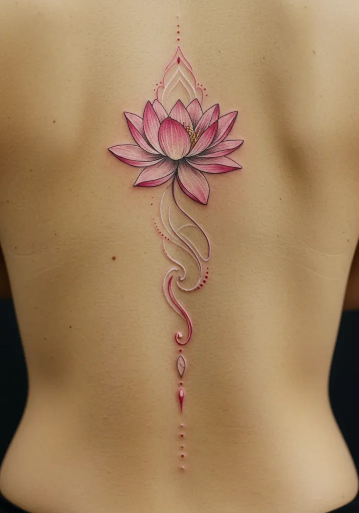 This gorgeous fine line tattoo features a beautifully detailed lotus flower at the top of the spine, with soft pink and purple hues that fade elegantly into delicate swirl patterns. The design flows down the spine with a graceful, almost ethereal feel, highlighted by tiny dotwork accents that add a touch of magic. The fine lines of the lotus petals are exquisite, creating a soft yet striking contrast against the clean skin. The winding, flowing lines give the impression of movement, making this piece feel like it s alive and unfolding.
