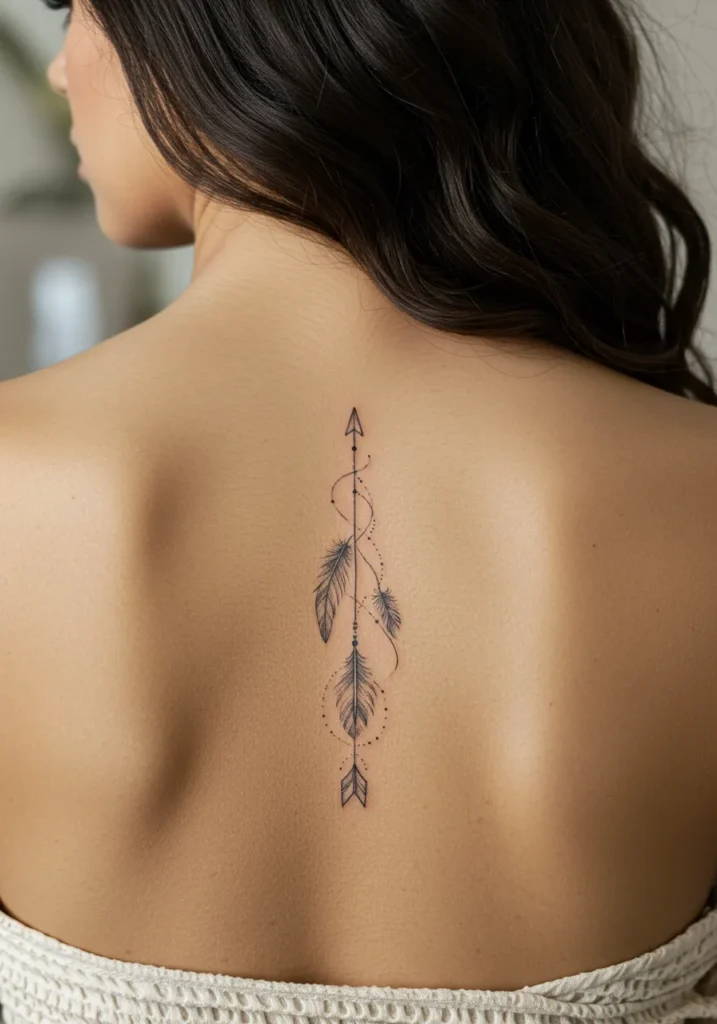 I absolutely love how this tattoo combines delicate details with a powerful, simple design. The fine line work feels so refined and elegant, making it perfect for someone looking for a feminine and graceful spine tattoo. The feathers offer a nice touch of softness while the arrow brings in just the right amount of edge. It s a tattoo that feels effortlessly cool and meaningful at the same time.