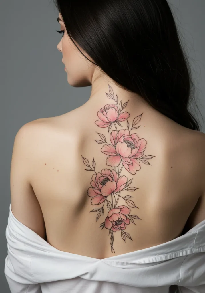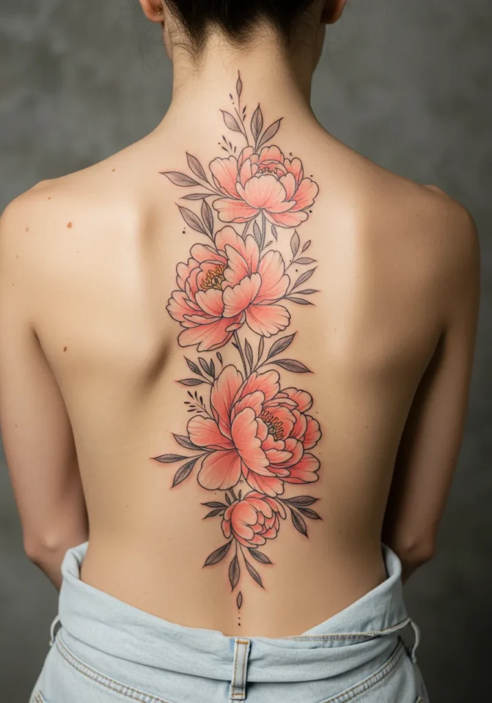 I absolutely love how delicate and romantic this tattoo is! The peonies add a perfect pop of color, while the fine line detailing gives it a soft, almost airy feel. The way the flowers are positioned down the spine makes it look as though they are gently growing from within, creating a sense of organic flow. It s a perfect blend of elegance and nature, and I can definitely see this being a beautiful choice for anyone looking for a feminine and meaningful tattoo. It s absolutely stunning and so thoughtfully designed!