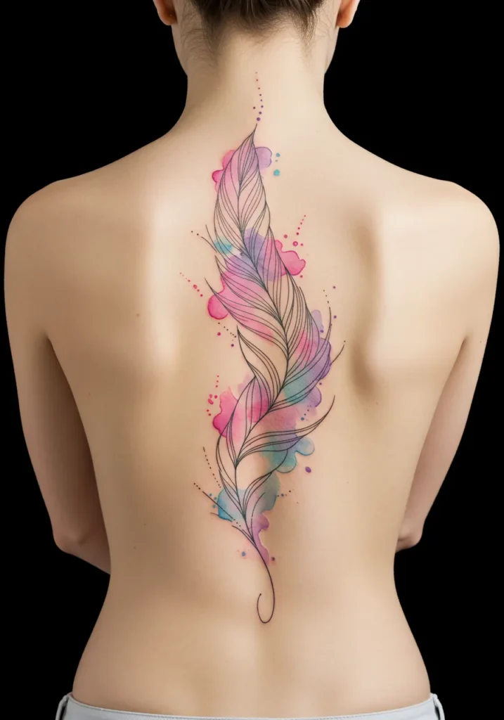 This beautiful fine line tattoo features a large feather elegantly stretching down the spine, with delicate, flowing lines that are both sharp and graceful. The feather is enhanced with soft watercolor splashes in shades of pink, blue, and purple, creating a dreamy and vibrant effect that contrasts beautifully with the sharp, clean lines of the feather itself. The tattoo s lightness and fluidity make it feel like a natural part of the body, with the colors gently blending into each other to enhance the organic shape of the feather.