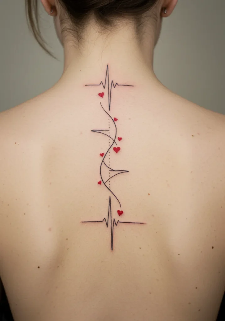 I m absolutely in love with how this tattoo symbolizes both life and love in such an understated way. The heart rate line, combined with the playful addition of tiny hearts, gives it a personal and meaningful touch, while still being incredibly stylish. I adore the soft, minimalist lines everything is simple, yet full of depth. It s such a beautiful, modern take on spine tattoos, and it s perfect for anyone who wants something meaningful and graceful. The placement along the spine also adds a touch of elegance, making it a truly striking piece.