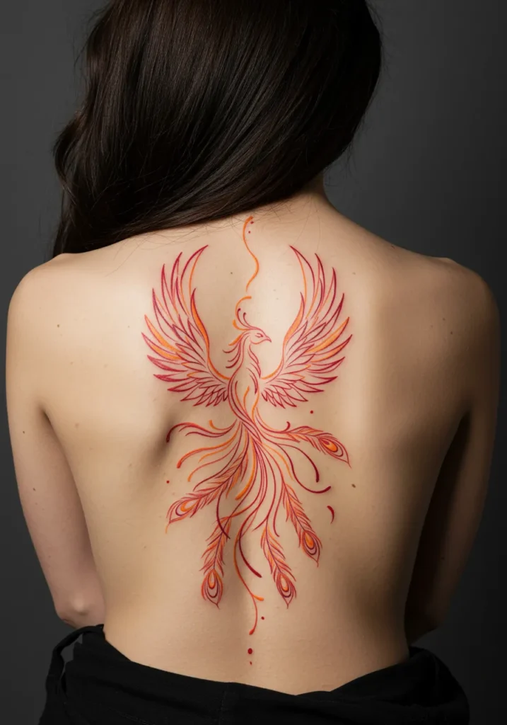 This vibrant phoenix spine tattoo is a beautiful example of fine line artistry. The fiery bird is depicted in stunning shades of red and orange, with its wings outstretched and tail feathers flowing delicately down the spine. The intricate, flowing lines of the feathers and tail feathers create a sense of movement and grace, while the dotwork accents add a soft, ethereal touch to the design. The tattoo s color palette is bold yet delicate, making it both striking and feminine.