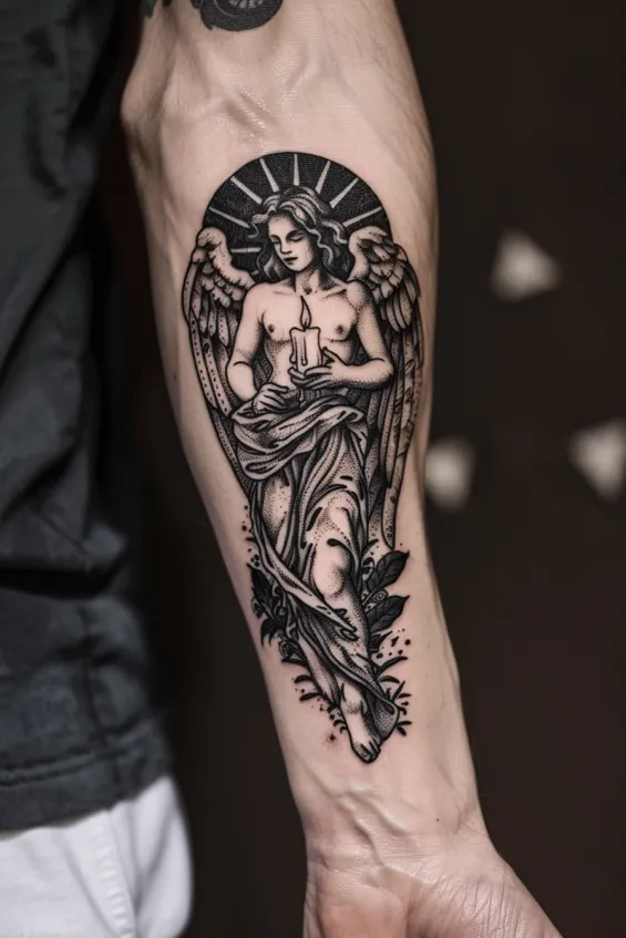 This beautifully detailed forearm tattoo depicts a celestial angel cradling a candle, framed by a radiant halo. The intricate dotwork shading gives the design a timeless, almost sacred feel, while the flowing robes and delicate wings add a sense of movement. Positioned along the forearm, the tattoo elongates the space, creating an elegant and balanced composition.