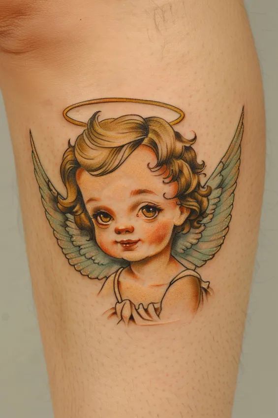 What makes this tattoo so special is the timeless, old-school aesthetic. It feels like a little guardian angel with a playful, innocent vibe. The soft color palette and painterly details make it stand out in the best way perfect for anyone who loves tattoos with a touch of whimsy and retro beauty.