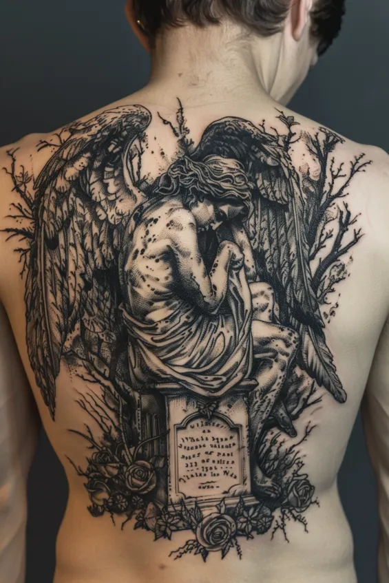 This incredibly detailed back tattoo features a grieving angel seated on a tombstone, surrounded by barren trees and delicate roses. The fine line shading and rich black ink give it an almost sculptural quality, making the angel appear as though carved from stone. The sorrowful pose and intricate textures create a deeply emotional and artistic masterpiece.