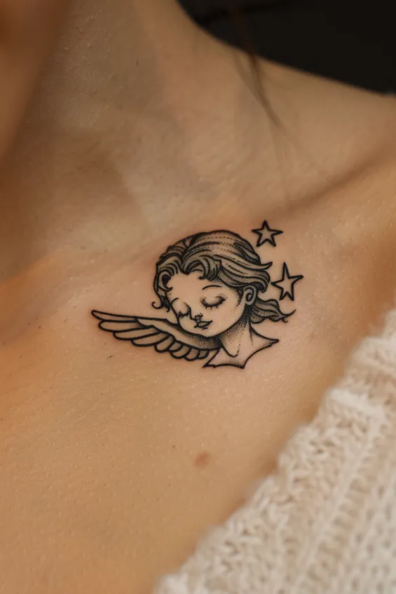 This delicate collarbone tattoo features a serene angel with closed eyes, a soft smile, and a single wing resting beside their face. Tiny stars float around, adding a whimsical touch to the design. The fine linework and subtle shading give it a dreamy, almost storybook-like quality, making it feel both elegant and enchanting.