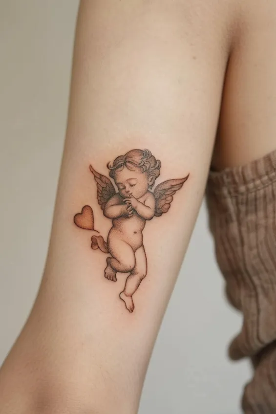 This charming tattoo features a tiny cherub in mid-flight, hands sweetly clasped and a heart floating nearby. The soft shading and delicate linework give it a classic, almost antique feel, making it look like a piece of Renaissance art brought to life. The subtle warmth in the color palette adds a touch of romance, making it even more endearing.