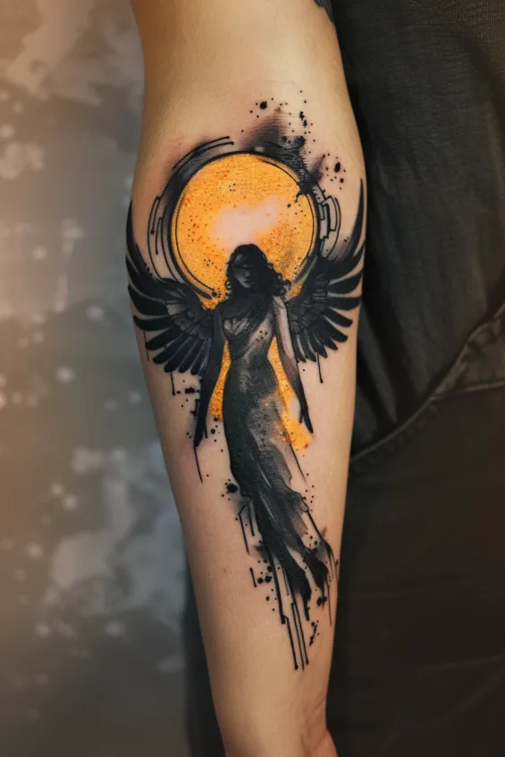 This striking forearm tattoo features a mysterious dark angel with outstretched wings, silhouetted against a glowing golden halo. The bold black ink contrasts beautifully with the vibrant orange hues, creating a dramatic and eye-catching effect. The watercolor splashes and abstract elements give the design a raw, artistic feel, making it look like a masterpiece painted onto the skin.