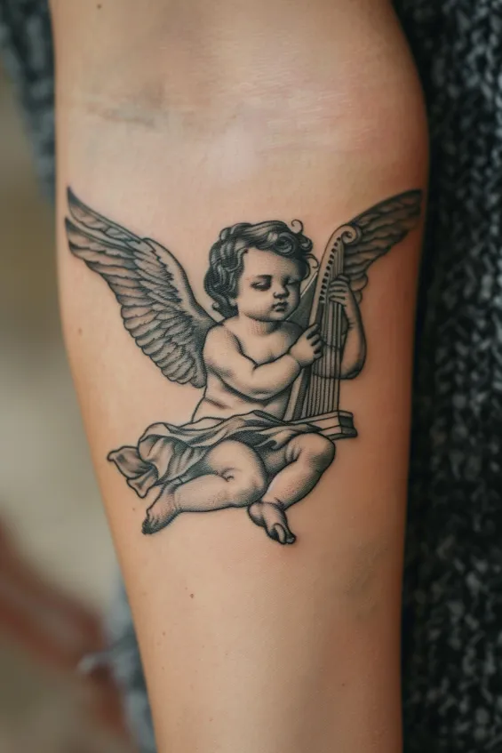 Cherub Playing Harp Forearm Tattoo