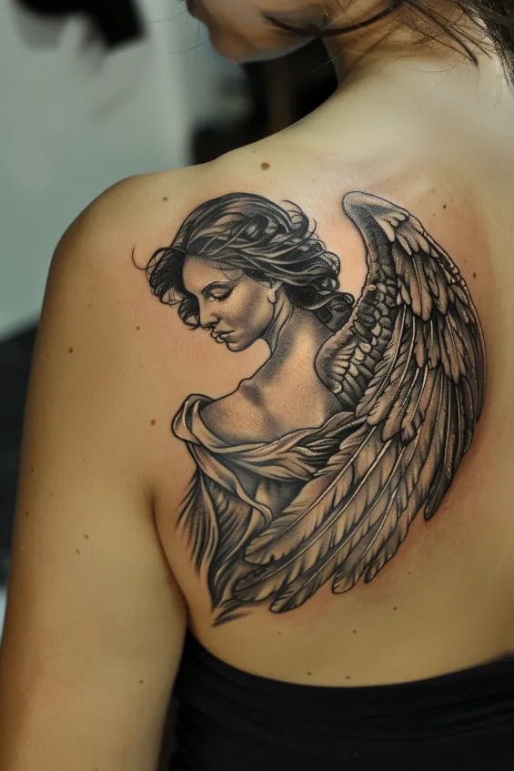 This breathtaking shoulder blade tattoo features a graceful angel with flowing hair and intricately detailed wings. The shading gives it a soft, almost sculptural effect, making the angel look like she s gently emerging from the skin. Her downward gaze and serene expression add a sense of calm and quiet strength, making this design both powerful and elegant.