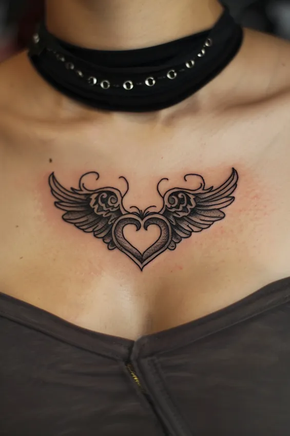 What makes this tattoo so special is the balance between strength and femininity. The combination of wings and a heart symbolizes love, protection, and freedom like a personal emblem of inner strength. The placement right below the collarbones makes it feel intimate yet bold, perfect for anyone looking for a meaningful and stylish tattoo that s always close to the heart.