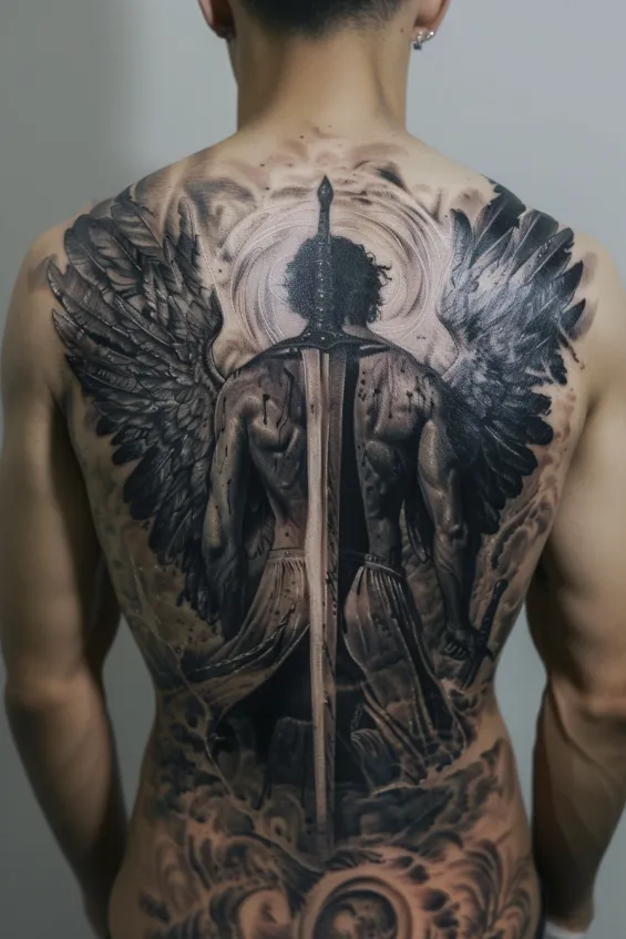 This jaw-dropping full-back tattoo showcases a powerful warrior angel standing tall with massive wings spread wide. A long, imposing sword runs down the center of the back, perfectly aligned with the spine, creating a dramatic and commanding presence. The intense shading and fine details bring this celestial warrior to life, making it feel almost three-dimensional.