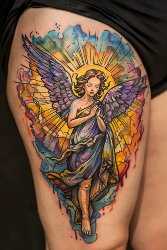 Vibrant Watercolor Angel Thigh Tattoo