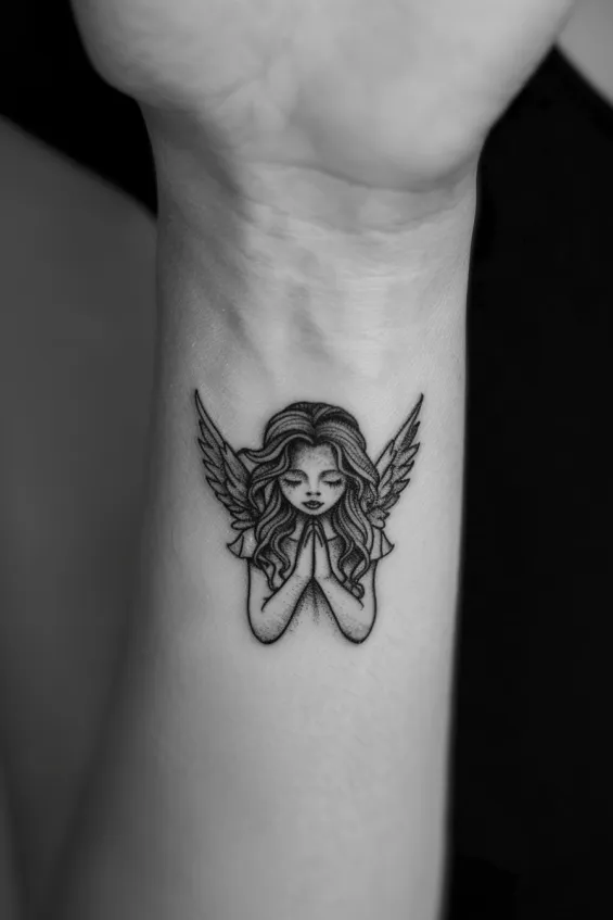 This delicate wrist tattoo features a small angel with flowing hair and feathered wings, hands gently pressed together in prayer. The fine lines and soft shading create a beautifully subtle yet meaningful design. Placed on the wrist, this angel feels like a constant reminder of peace, faith, and inner strength, making it both personal and symbolic.