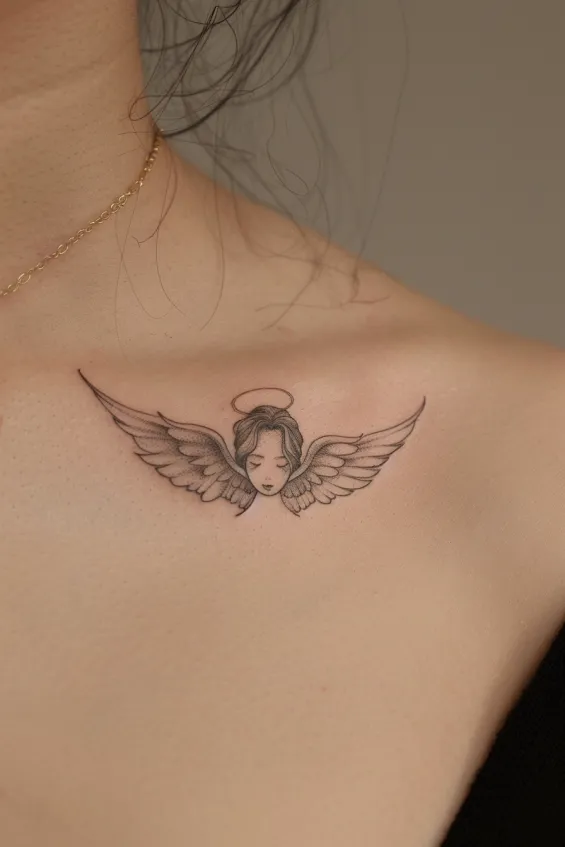 This beautifully subtle collarbone tattoo features an angelic face framed by a soft halo and outstretched wings. The fine linework keeps the design light and airy, while the gentle shading adds just the right amount of depth. Placed gracefully along the collarbone, this tattoo enhances the natural curves of the body, making it both elegant and effortlessly stylish.