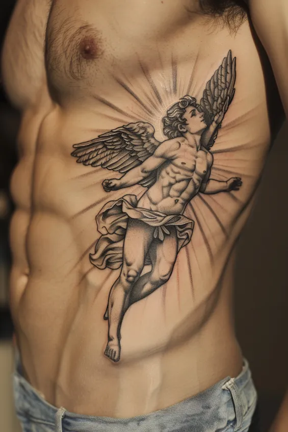 This breathtaking rib tattoo features a muscular angel soaring upward, bathed in radiant light. The intricate shading highlights every detail, from the finely textured wings to the flowing fabric that adds movement to the piece. Positioned along the ribs, the tattoo follows the body s natural curves, making it both dynamic and visually striking.