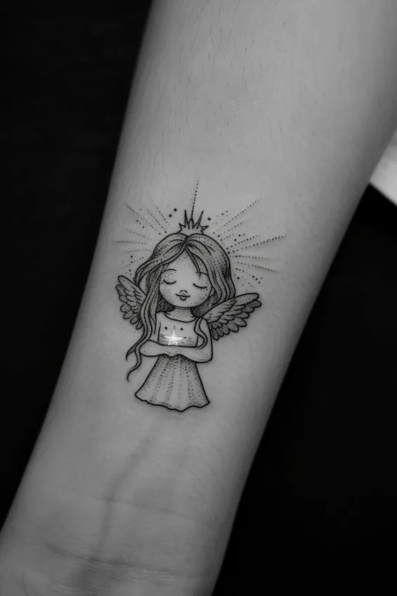This adorable forearm tattoo features a sweet little angel with a peaceful expression, hands gently cradling a glowing light. The fine dotwork shading creates a soft, dreamy effect, while the tiny crown and radiating lines add a celestial charm. The delicate wings and flowing dress give it a fairy-tale-like quality, making it both comforting and uplifting.