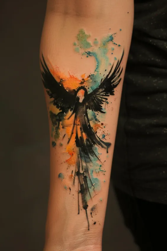 This stunning tattoo features a dark angel silhouette with bold, outstretched wings, surrounded by an explosion of vibrant watercolor splashes. The fluid mix of deep black, fiery orange, and calming blues creates a breathtaking contrast, making the design feel like a celestial force bursting through the skin. The artistic drip effect adds an edgy, modern twist, giving it a dynamic and free-flowing look.