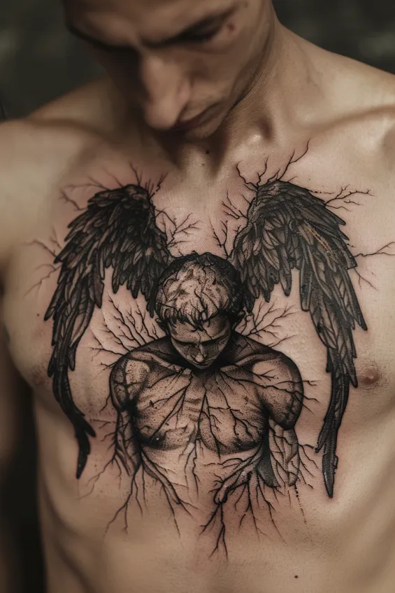 This hauntingly beautiful chest tattoo features a fallen angel with cracked skin, darkened wings, and a bowed head. The intricate shading and vein-like fractures give the design an intense, almost sculptural look, making the angel appear as though it s breaking apart. The dramatic placement across the chest amplifies its emotional depth, making it a bold yet deeply symbolic piece.
