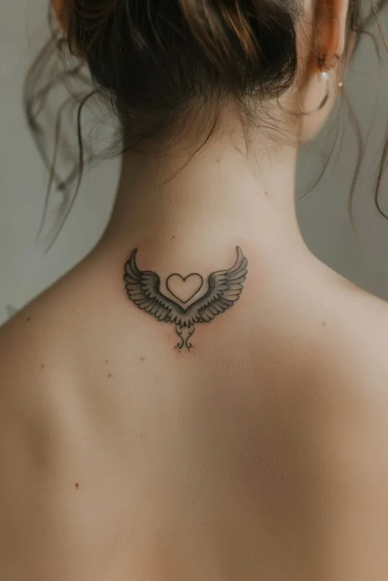 This delicate neck tattoo features a beautifully simple pair of angel wings gracefully curving around a heart. The fine linework gives it a soft, airy feel, making it an elegant yet understated piece. Placed right at the nape, it adds a subtle, almost hidden charm like a little secret reminder of love, protection, and freedom.